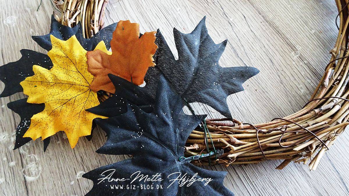 Da jeg gik mit Efterårs pynt igennem i kælderen fandt jeg nogle sorte blade som jeg ikke havde set i mange år, og som jeg faktisk troede at jeg havde fået smidt ud, men heldigvis var de gemt i bunden af en kasse. Og det gav mig idéen til at prøve at lave en krans hvor jeg kunne bruge dem.